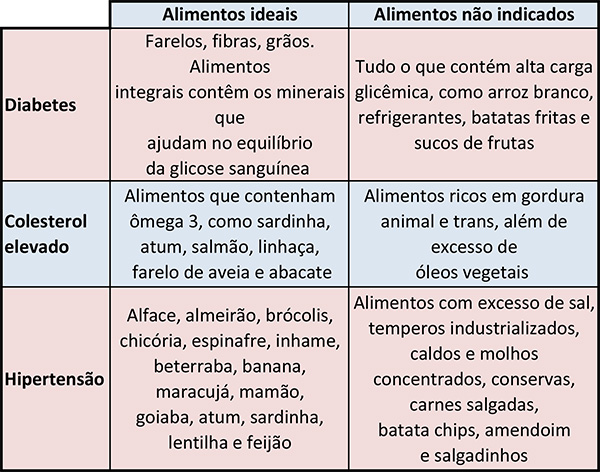 Além do colesterol, outros fatores prejudicam o funcionamento do coração como: diabetes e pressão arterial elevada (ou hipertensão). Confira na tabela abaixo os nutrientes ideais e também os não indicados para consumo em cada um dos casos:
