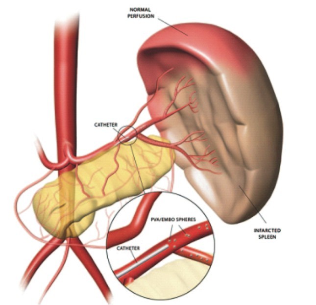 Através de um cateter e um microcatéter, a artéria que irriga o baço (artéria esplênica) é cateterizada. Partículas são injetadas para obstruir parcialmente a circulação do baço.